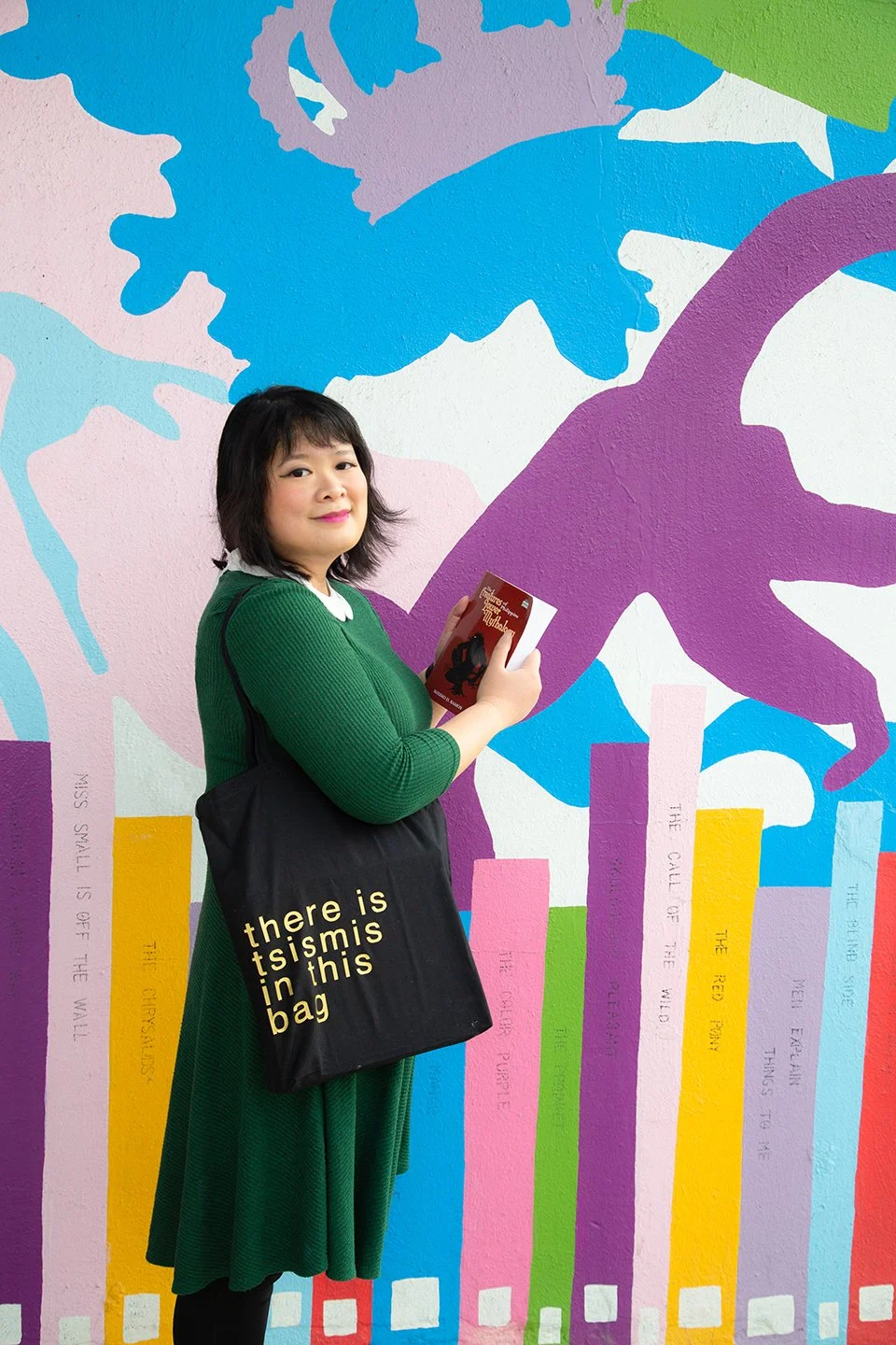 Nathalie is a Filipina-Canadian woman with light-medium tan skin and chin-length black hair smiles gently over her shoulder, wearing a forest-green dress and a black tote that reads “there is tsismis in this bag.” She cradles a paperback against a vibrant, book-spine–themed mural.